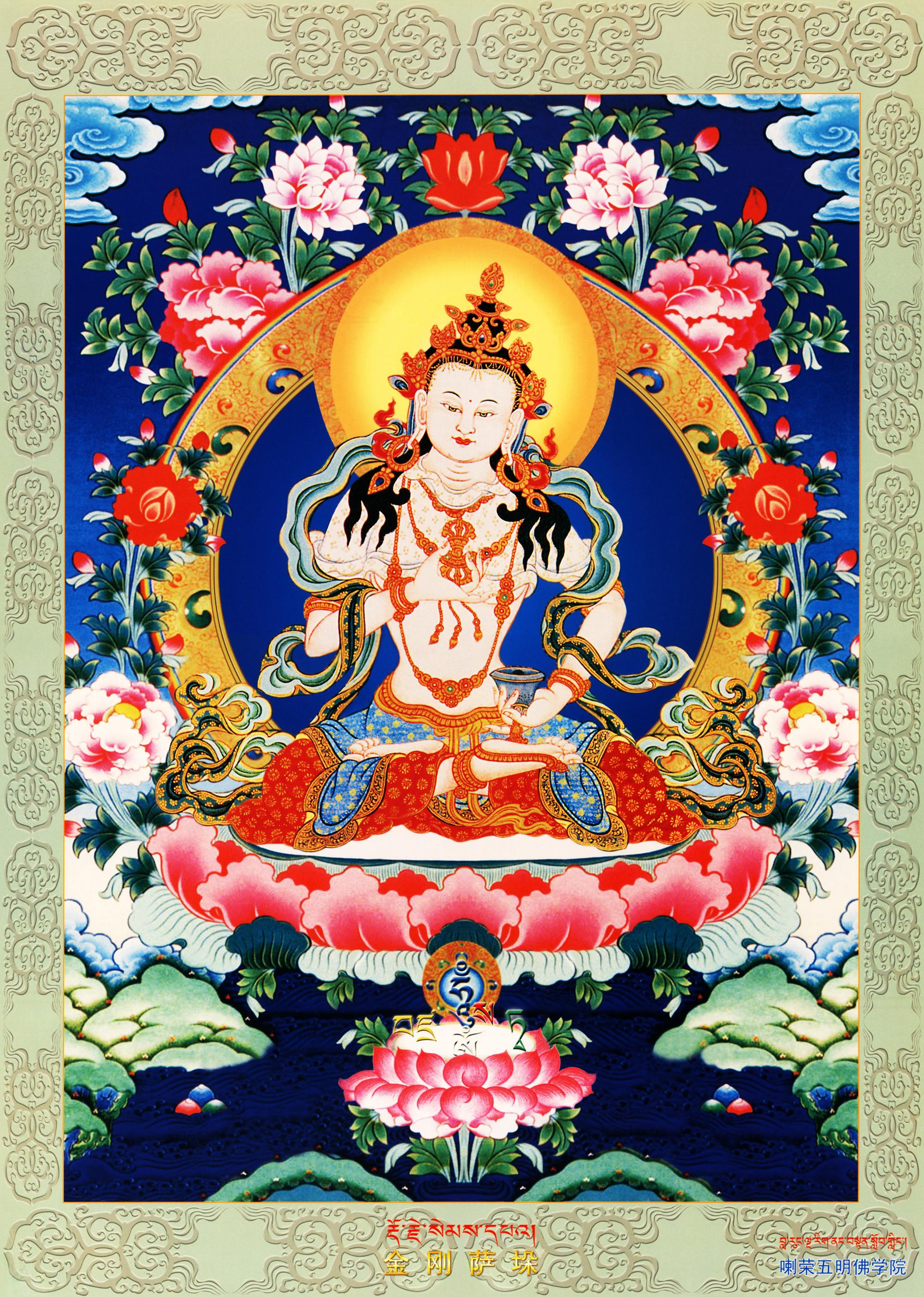 Когда же устремление его осуществилось, возникли эта медитация и рецитация славного Ваджрасаттвы. Ваджрасаттву почитают как воплощение просветленных тела, речи, ума, качеств и активности всех будд. Ваджрасаттва воплощает просветленные качества всех будда-семейств, и поэтому он известен как “Владыка Океана Мандал”.
